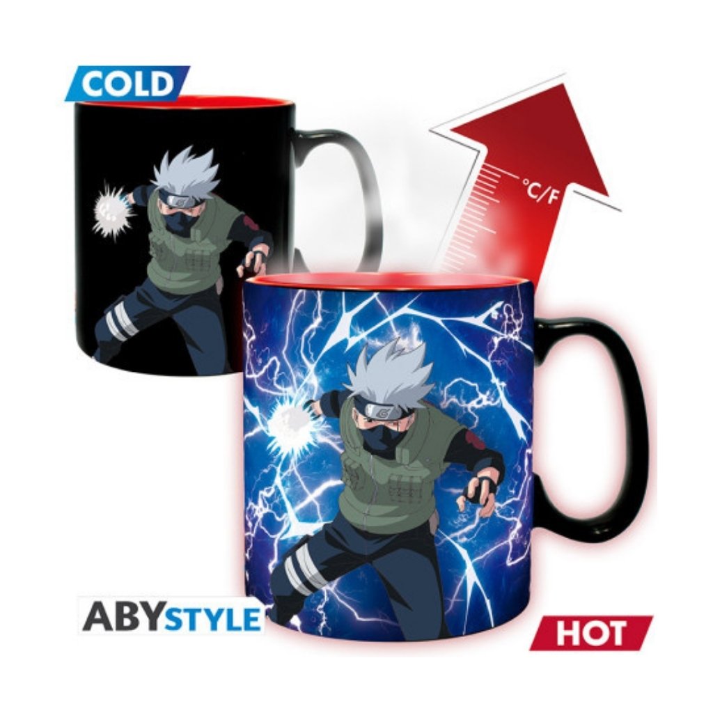 La taza cambia de diseño con el calor: cuando está fría, muestra a tu personaje favorito en negro; pero al verter tu bebida caliente, se revela una escena llena de color y poder que hará que tu desayuno parezca un auténtico jutsu.